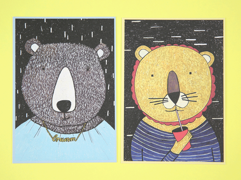 2 Karten / Tierfreunde / Bär & Löwe Die Zeichnungen sind auf Papier mit Acrylmarkern angefertigt und auch als Original Zeichnung zu haben. Gedruckt auf feinstem Recycling 400g Papier im A6 Format.